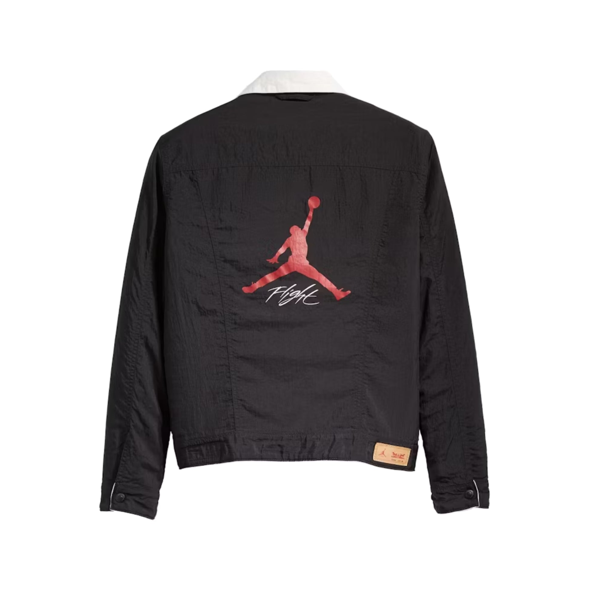 The jacket features a reversible design, allowing you to switch between two distinct looks. On one side, you'll find a black jacket with contrasting collar and sleeves, accentuated by red accents on the outer collar and sleeves. The black side showcases a rugged exterior with a contrast collar and sleeves in red accents. On the reverse side, a 'Flight' graphic is displayed with Jordan's signature stamped across, representing the collaboration between Air Jordan and Levi´s. A leather brand patch adds a premium touch to the jacket's design.